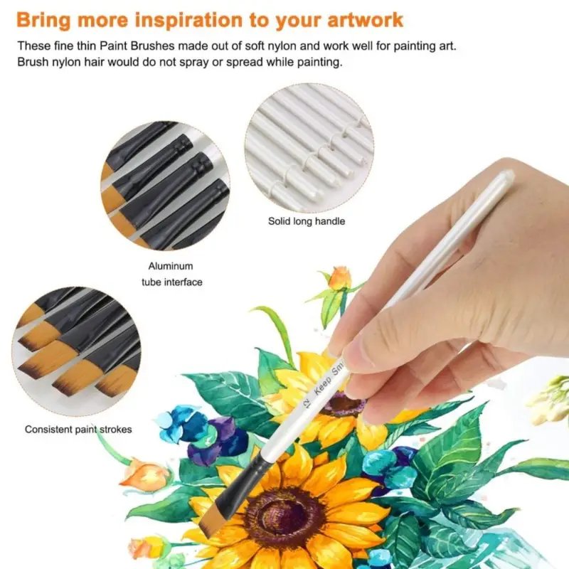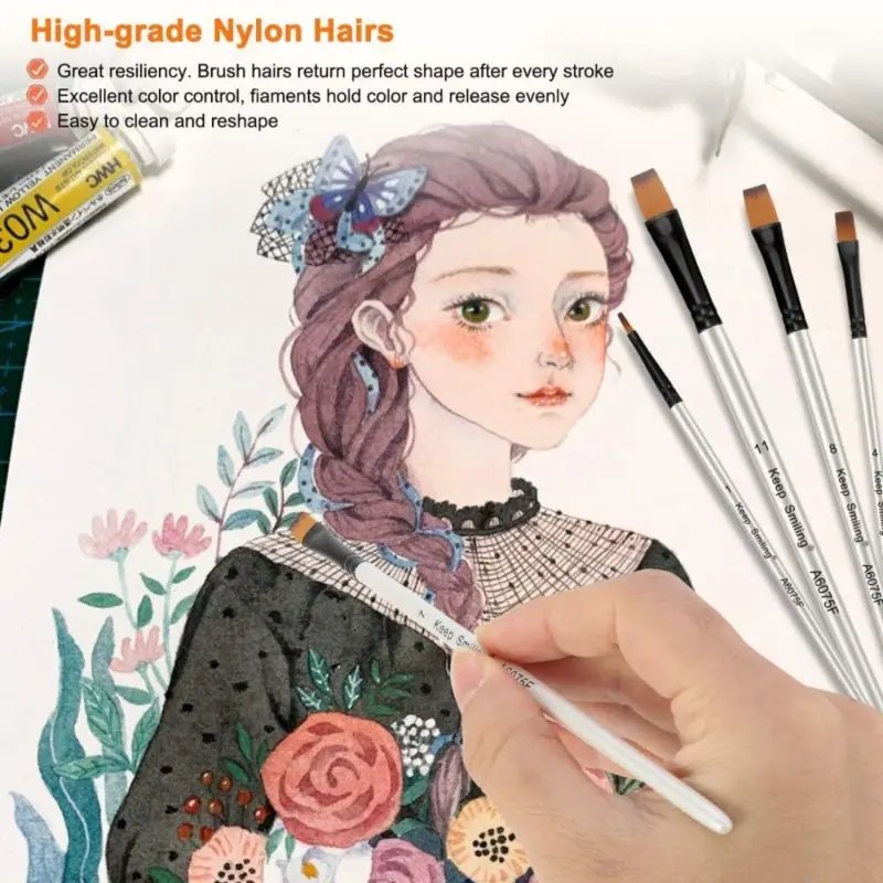 Keep Smiling Artistic Brushes 12Pcs Set is a versatile collection perfect for artists of all skill levels. This set includes 12 high-quality brushes in various sizes and flat shape suitable for painting with watercolors, acrylics, oils, and other mediums. Each brush is designed with soft, durable bristles that provide smooth, precise strokes, making it easy to achieve fine details or bold strokes. The comfortable grip ensures ease of use during long painting sessions, while the variety of brushes allows for creativity in every project. Ideal for both professionals and beginners, this set is great for crafting, painting, and detailed art.