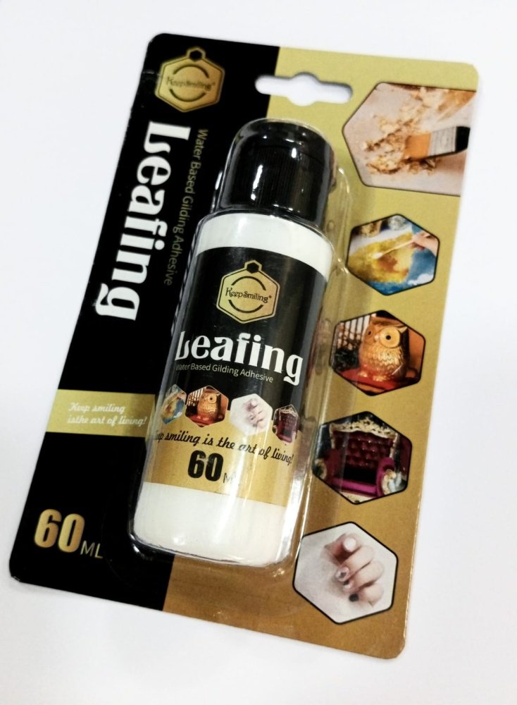 Keep Smiling Leafing Glue is a non toxic, water based gilding adhesive. The adhesive stays open where extended tack time is required, it dries to a translucent finish and cleans up in water.It can be used straight from the bottle with no dilution on porous and non porous surfaces, including: wood, plaster, glass, metal, leather and canvas. Proper tack will develop in 25mins at normal humidity and it will stay open for 24hrs.